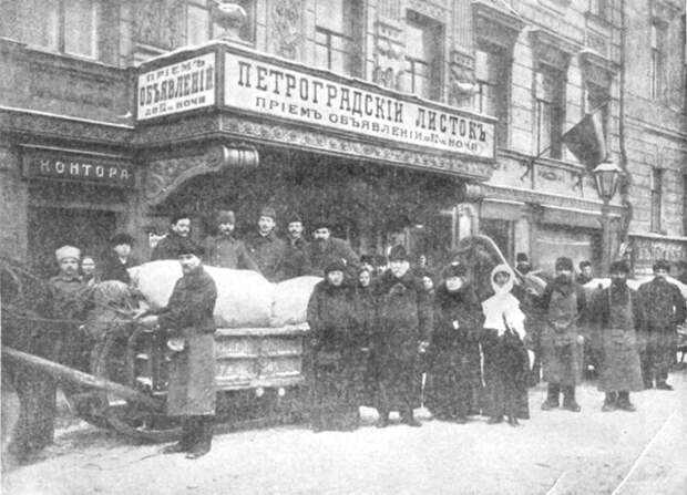 Набережная Екатерининского (Грибоедова) канала, 31. Отправление на позиции пожертвований, собранных «Петроградским листком», 1 февраля 1916 г.