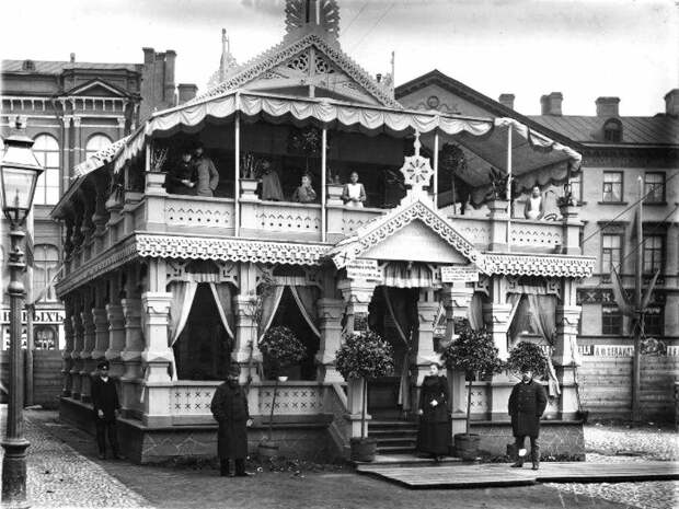 На снимке - временный павильон Общества трезвости, построенный чайной фирмой «Сыновья Петра Боткина» на Манежной площади.
