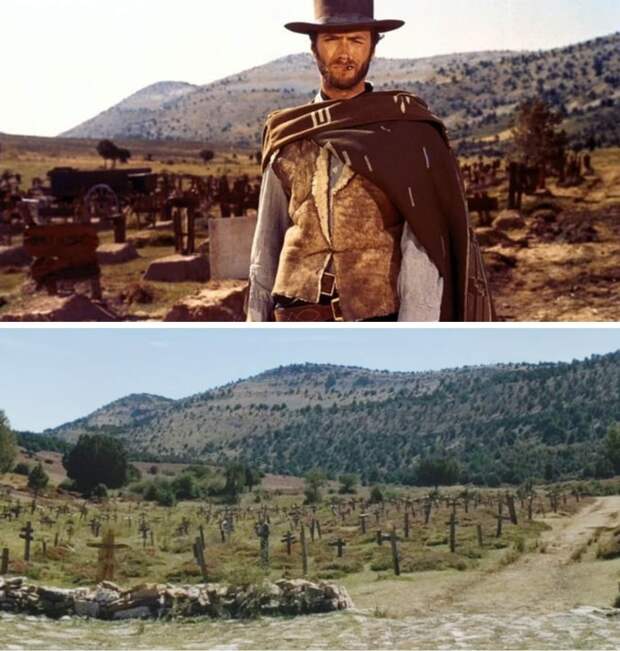 Кадр из фильма «Хороший, плохой, злой» 1966 года и то же место в 2020 году