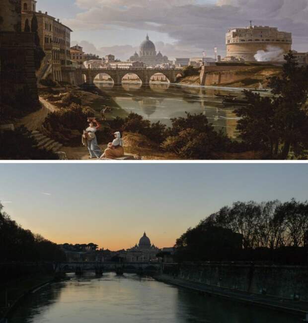 Вид на Рим с берега Тибра на картине 1834 года и на современной фотографии