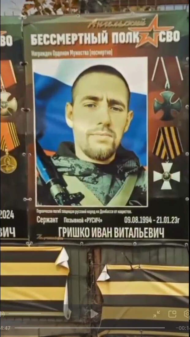 21 января 2023 года в ходе Специальной Военной Операции, выполняя свой воинский долг, героически погиб Гришко Иван Витальевич – сержант, командир взвода, позывной «Русич».