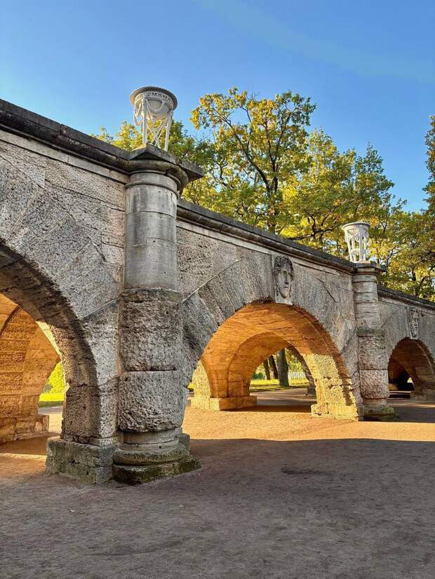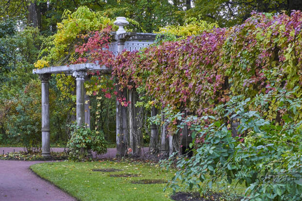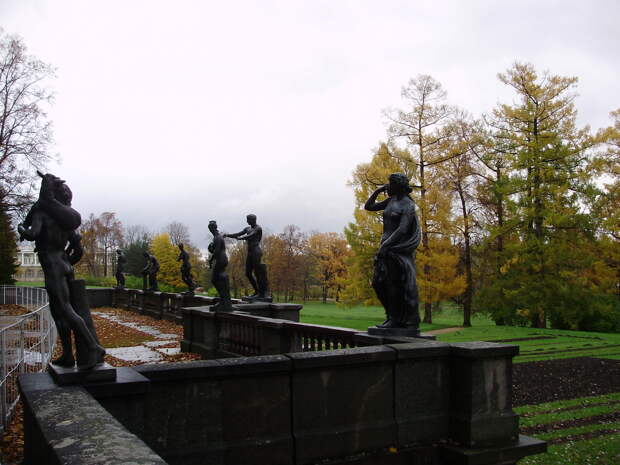 Галерея, задуманная Екатериной II для прогулок и философских бесед, расположена на склоне холма, на границе регулярной и пейзажной частей парка.