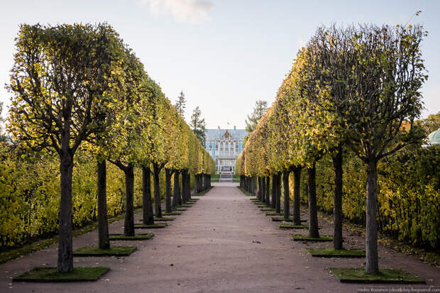 Вид на Екатерининский дворец сквозь боскеты регулярного липового парка.