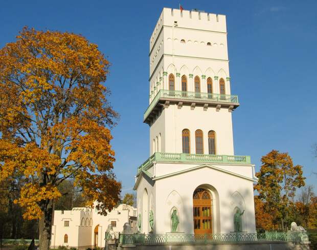 Когда-то здесь содержался зверинец для царской охоты, потом его разобрали и на этом месте возвели башню в 1827 году. Павильон построили в готическом стиле по проекту архитектора Адама Менеласа.