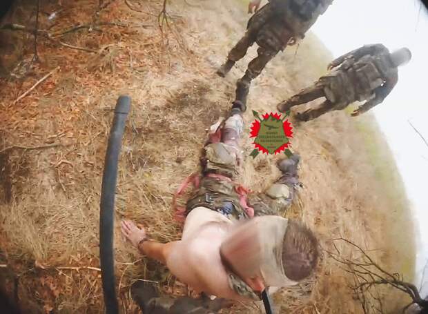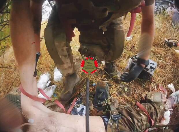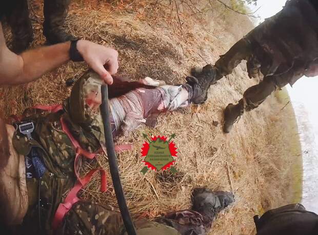 Процесс эвакуации разведчика армейского спецназа после подрыва, в результате чего он получил ранения ног.