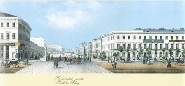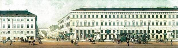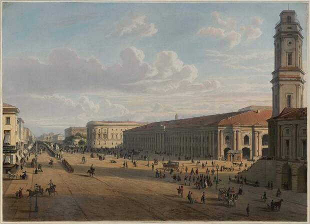 Невский проспект у Гостиного двора. Литография Ж. Жакотте с рисунка И.Шарлеманя. Середина XIX века.