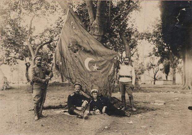 Русские офицеры у трофейного турецкого знамени. Первая мировая война, Кавказский фронт, 1916 г.