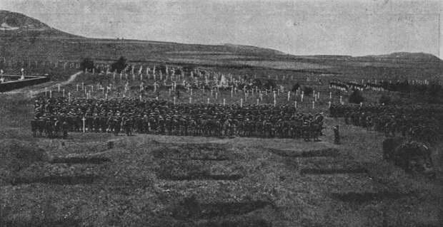 Японские войска лицом к кладбищу отдают честь павшим русским воинам при защите Порт-Артура, 1908 год.