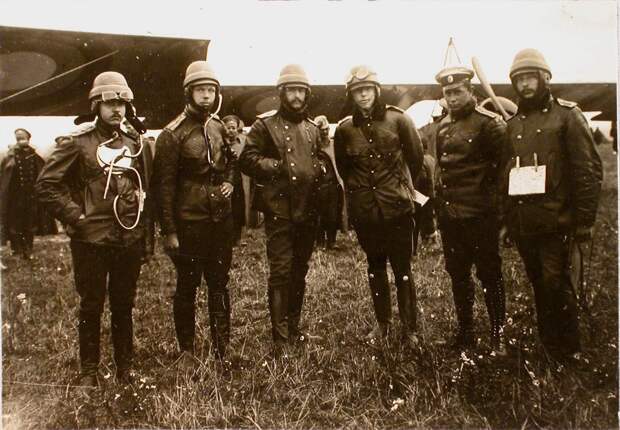 Русские авиаторы, 1915 год.Слева на право: прапорщики Федоров и Кособрюхов, есаул Ткачев, поручик Бржезовский, лейтенант Дыбовский, поручик Журавлев. Карчевице, 15 октября 1915 года