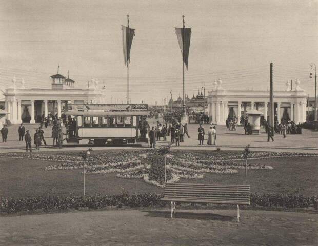 Электрический трамвай у главного входа на Всероссийской промышленной и художественной выставке. Нижний Новгород, 1896 год.