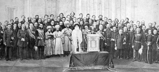 Имам Шамиль с сыновьями в парадной зале Калужского губернского дворянского собрания после принесения ими присяги российскому престолу, 1866 год.