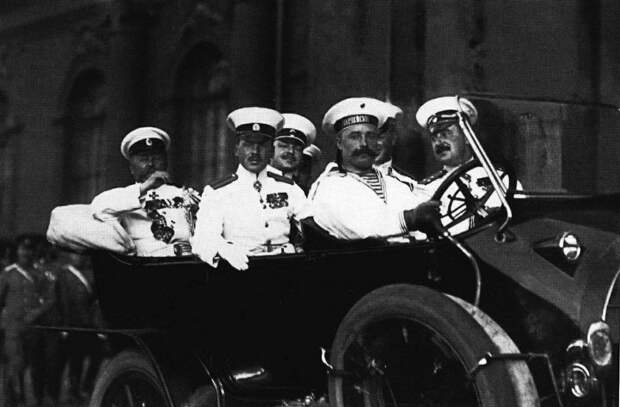 Морской гвардейский экипаж. Офицеры на автомобиле на Дворцовой площади. Санкт-Петербург, 1914 г.
