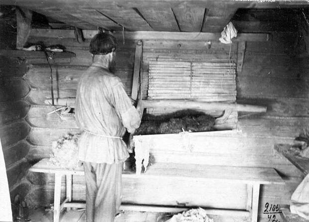 Сельский кустарь занимается трепанием шерсти в Шуйском уезде Владимирской губернии. Начало ХХ века.