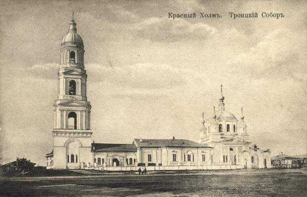 Троицкий собор в городе Красных Холм. Весьегонский уезд, Тверская губерния. 1899 год. В Красном Холме сохранилась колокольня Троицкого собора, построенная в 1870 году по проекту архитектора В.И. Кузьмина. Сам Троицкий собор разобран в 1930 году.