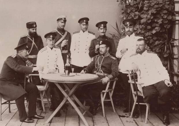 Великий князь цесаревич Николай Александрович и его друзья из Преображенского полка у полкового офицерского клуба в летнем лагере императорской гвардии в Красном Селе.