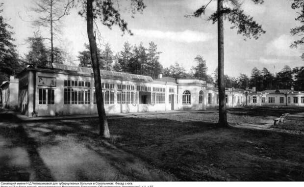На фотографии запечатлен первый городской санаторий в Москве — Туберкулезный санаторий имени Четвериковой. Снимок сделан в 1913-1914 гг. Открыто учреждение было в начале XX века в парке Сокольники. Его построили на средства А.Д. Четвериковой по плану фтизиатра А.Н. Алексина. Всего в этом санатории было 25 коек.