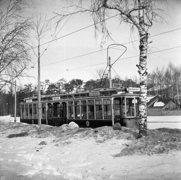 Сокольники. Вагон электрического трамвая, остановка. Москва, 1900-е.