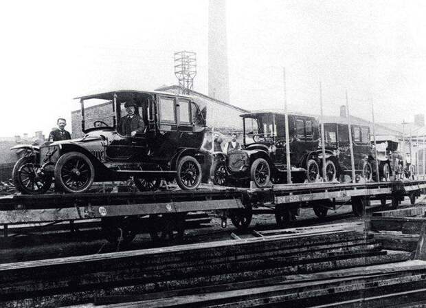 Отгрузка готовых автомобилей "Руссо-Балт" модели "С24" — две с кузовами ландоле, одна — лимузин, одна дубль-фаэто, автомобили XII серии. 1912 год.
