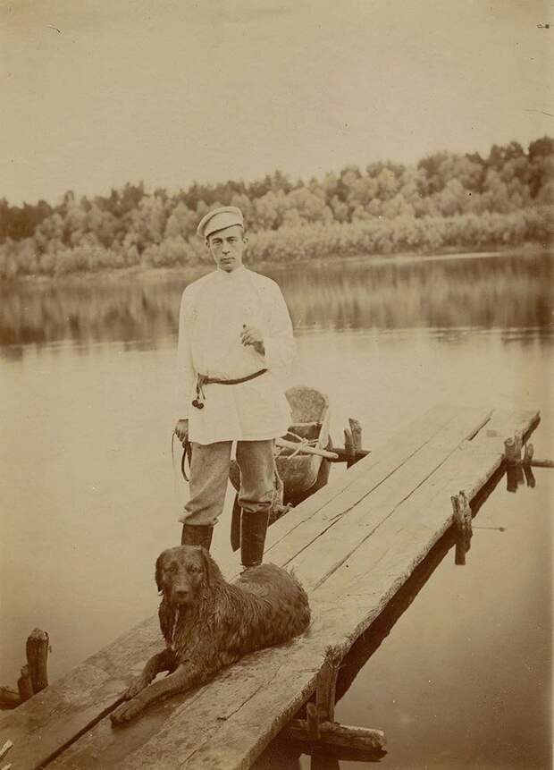 Сергей Рахманинов со своей собакой Левко. Имение Красненькое, Воронежская губерния, 1899 год
