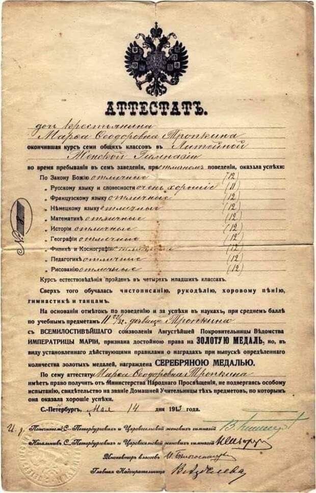 Дореволюционное образование. Ученица С.Петербургской женской гимназии, дочь крестьянина. После семи классов знает: два языка (французский и немецкий), физику, математику, историю, географию, космографию, педагогику. Окончила с золотой медалью.