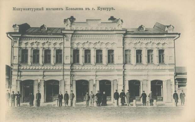 Мануфактурный магазин Ковалева в Кунгуре, 1900-е годы.Двухэтажный полукаменный особняк купца Иосифа Титовича Ковалева был построен аж в 1898 году.