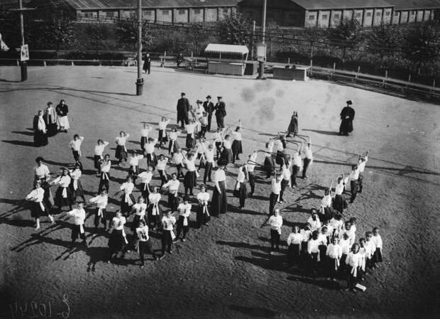 Народный дом Императора Николая II. Дети занимаются гимнастикой во дворе Народного Дома.
