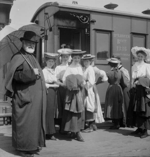 Гимназистки с сопровождающим возле вагона поезда. Москва, 1900-е.