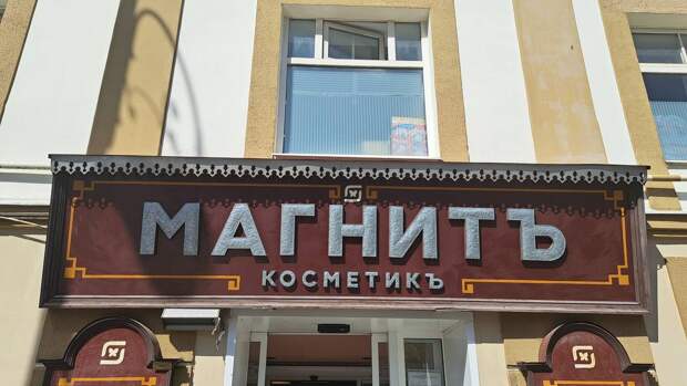 Ещё приятен тот факт, что даже сетевые магазины, вроде Магнита или Додо пиццы, переделали свои вывески, и теперь это выглядит очень интересно с точки зрения сочетания современных брендов и исторической стилистики.