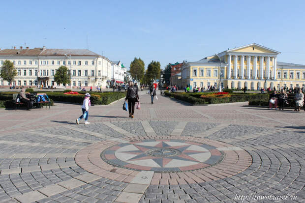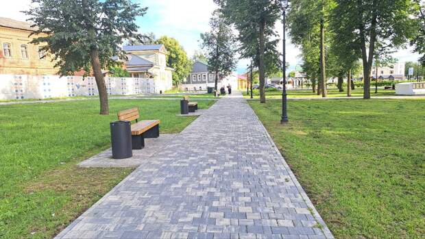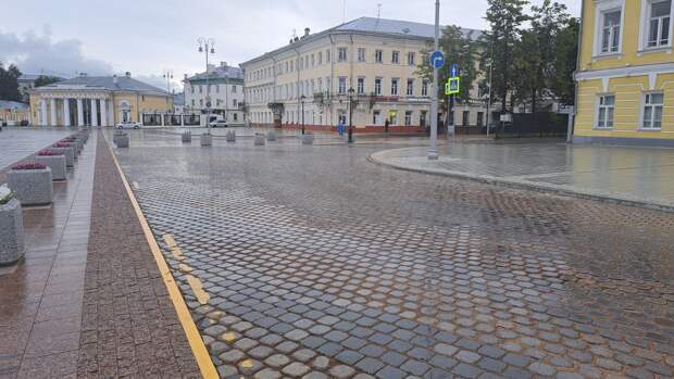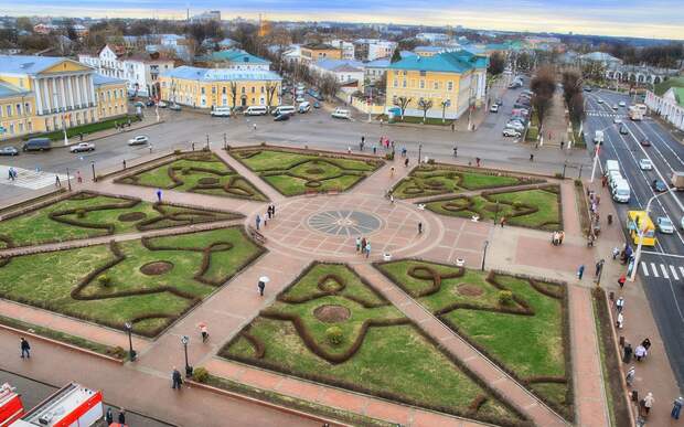 Центральную площадь Костромы замостили плиткой, поставили красивые фонари и скамейки, провели озеленение, но вместе с тем сохранили ощущение пространства. Окружающие автомобильные дороги замостили брусчаткой.