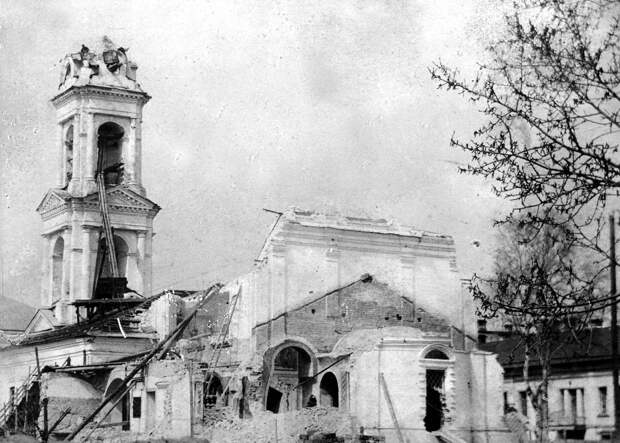 Разрушение Ильинской церкви. Фото начала 1930-х годов.Одним из сохранившихся, но изуродованных храмов стал храм Ильи Пророка на Русиной (Советской) улице. У храма XVIII века разрушили колокольню и четверик с куполами, оставив только трапезную и приспособив её под помещение для светских организаций.