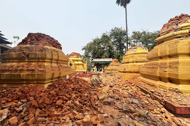 Повреждённые пагоды после мощного землетрясения в Нейпьидо, Мьянма, в субботу, 29 марта 2025 года. (AP Photo/Aung Shine Oo)