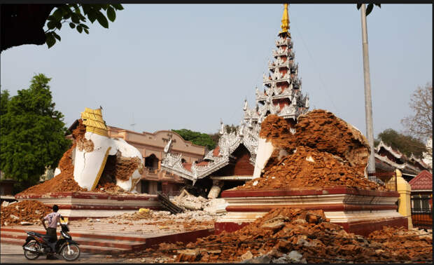 Катастрофическим ударом разрушен храм Будды Махамуни в Мандалае. Этот храм, построенный в конце XVIII века, хранит одну из главных буддийских святынь Юго-Восточной Азии — четырехметровую позолоченную статую Будды, которую, согласно преданию, сам Будда благословил при жизни. Храм веками был центром паломничества для миллионов верующих, но нынешнее землетрясение повредило его кровлю, вызвав обрушение нескольких секций здания.