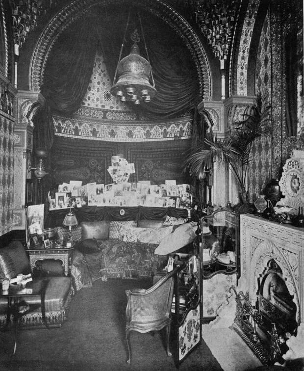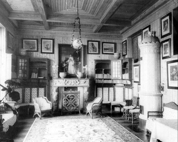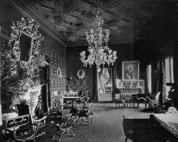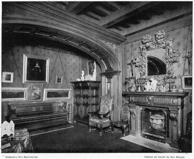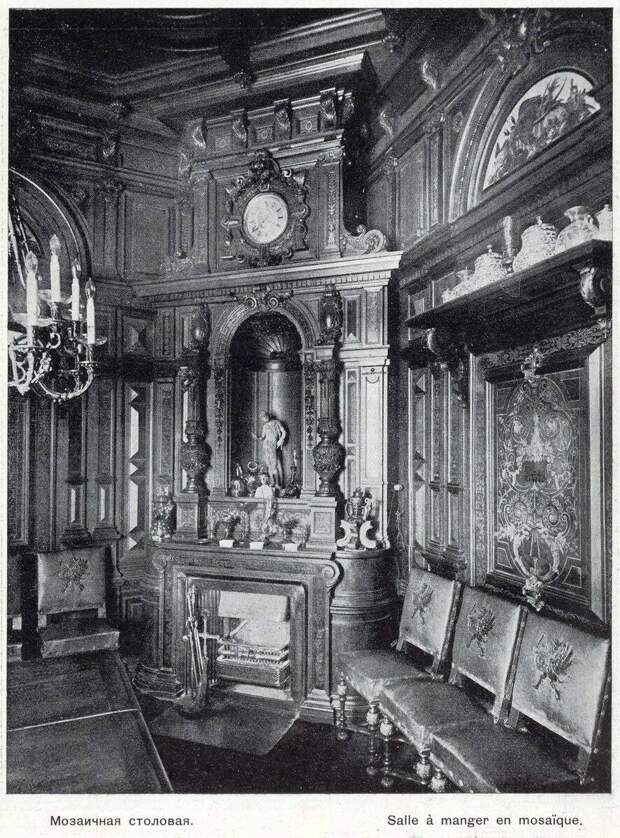 На первом этаже находился кабинет Сергея Александровича(фото 1). Он был оформлен в стилистике ренессанса. Рядом была столовая великого князя, которая называлась Мозаичной (фото 2). Деревянные панели в ней были оформлены мозаичными вставками. Интерьер сохранился, но попасть туда практически невозможно.