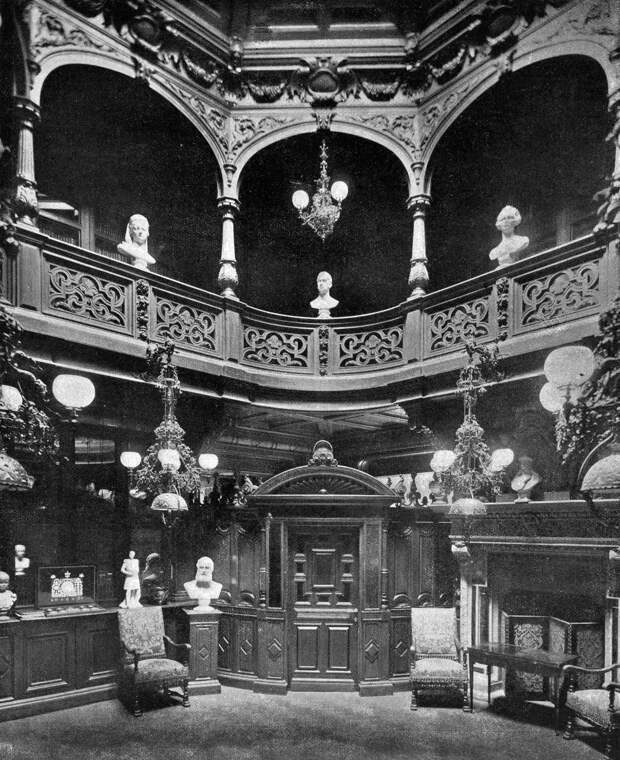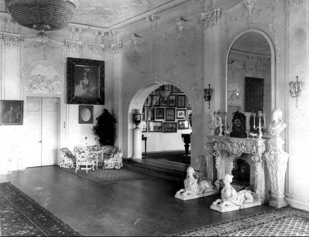 Интересный факт: Интерьеры особняка отличались роскошным декором и были отделаны ценным деревом, мрамором, украшены резными колоннами и лепниной: скульптурными фризами, цветами, фигурками амуров. В Большой гостиной стоял мраморный камин с зеркалом, который поддерживали кариатиды, а у подножья располагались два сфинкса, головы и грудь у которых были в облике дам XVIII века.