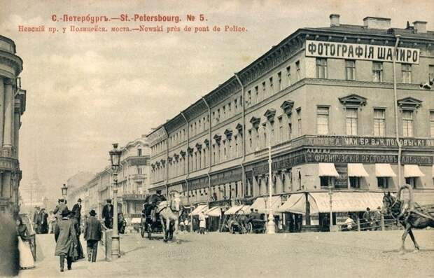 Невский пр-т. Здание с большим количеством вывесок, украшающих его фасад, включая таблички ресторанов, магазинов и фотомастерской, 1905 г.