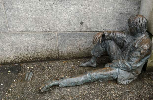 Этот бедняга, прислонившийся к стене у входа в Центральный Банк, представляет собой как мемориал, так и любого случайного человека. Он напоминает нам о том, что каждый человек заслуживает нашей помощи и внимания — неважно, богат он или беден. Мемориальная доска гласит: «Никто не является только тем, что вы видите» памятник должен напоминать людям о других, кому нужна помощь.