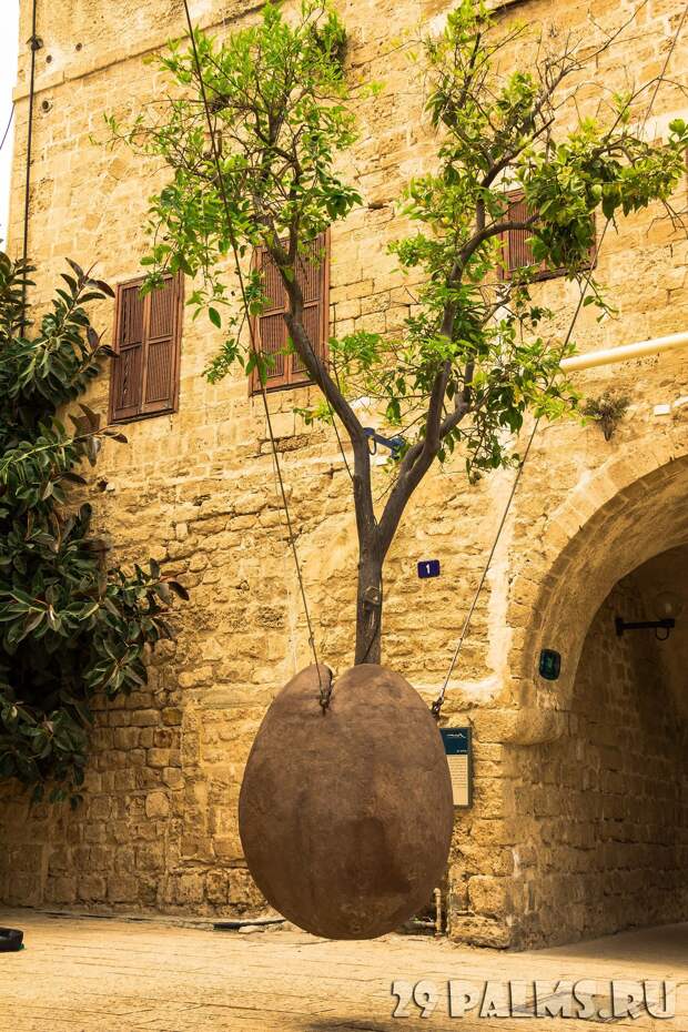 Висящее апельсиновое дерево находится в старом городе Яффо. Для Израиля апельсин – особенный фрукт. В 1948 году, когда страна только появилась, именно экспорт цитрусовых позволил экономике Израиля держаться на плаву. Деревья высаживали в яйцевидные горшки, висящие на веревках, натянутых между домами.