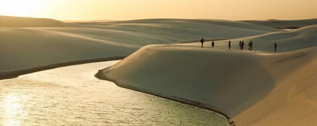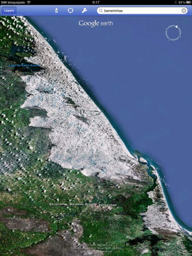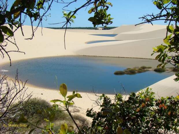 Белые фигуры на этой доске это сами дюны разных форм и величин, иногда с шапками в виде растительности, а черные фигуры это лагуны с дождевой водой которые заполняют пространства между ними.Оптимальное время посещения этих мест в отличии от Пантанала, это как раз и есть сезон дождей с Мая по Сентябрь,когда солнце ,которое как известно в районе экватора светит практически одинаково еще не успело осушить эти озера,..в этот период в них еще можно купатся и даже ловить рыбу, а уже в сухой сезон, когда лагуны высыхают под палящим солнцем при t 45C , или стираются вновь прибывшими дюнами,..эта местность больше напоминает пустыню Сахару-оправдывая свое негласное название “Бразильская Сахара”.