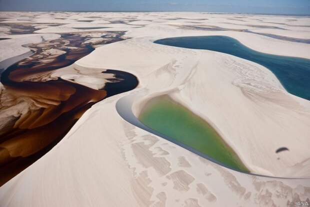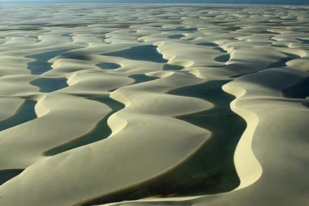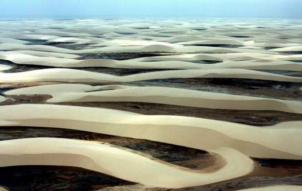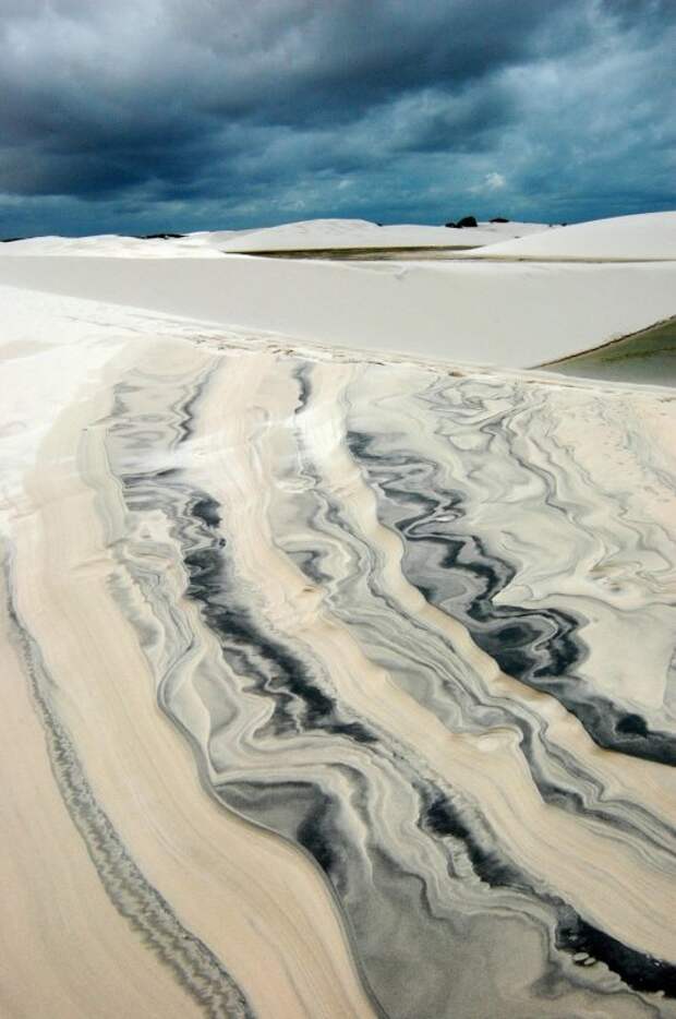 Белые фигуры на этой доске это сами дюны разных форм и величин, иногда с шапками в виде растительности, а черные фигуры это лагуны с дождевой водой которые заполняют пространства между ними. Сезон грозовых фронтов приходит со сравнительно недалекой Амазонии и создает свой собственный климат в этом регионе..,тонны воды изливаясь с неба заполняют пространства между дюнами образуя огромные лагуны,или гигантские лужи,которые потом медленно высыхают во время сухого сезона.