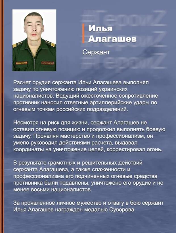 Сержант Илья Алагашев командовал расчётом орудия и, несмотря на артобстрел противника, вместе с подчинёнными остался на позиции выполнять боевую задачу. Они подавили вражеские огневые средства, уничтожили орудие и не менее восьми радикалов. Алагашева наградили медалью Суворова.