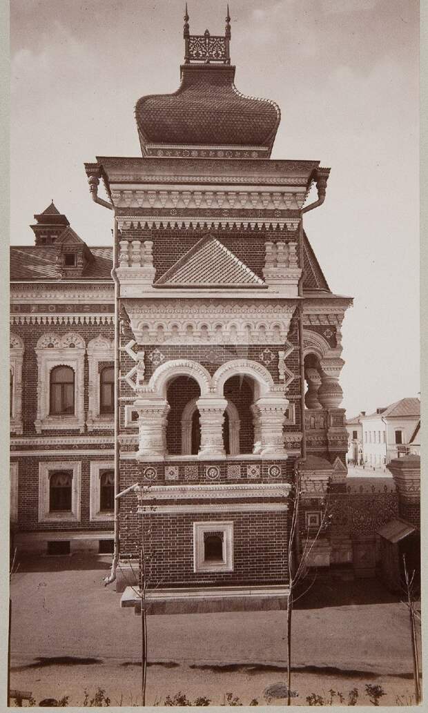 Правая сторона северного фасада Дома Игумнова на Якиманке, Москва. Фото ок. 1900-1910 годов Построен в 1888-1895 годах в русском стиле по проекту архитектора Н.И. Поздеева. Ныне в особняке располагается посольство Франции. Дом является объектом культурного наследия России.