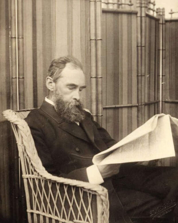 Павел Михайлович Третьяков - основатель и директор Третьяковской галереи в соломенном кресле за чтением газеты. Фото 1890-1900 годов.