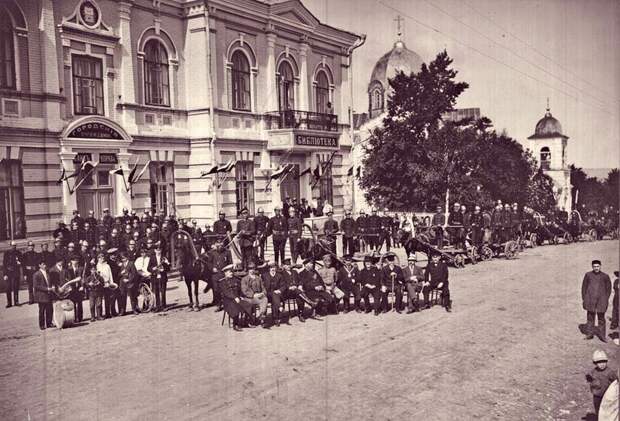 Пожарная вольная команда и оркестр около городской управы в Бирске, Уфимская губерния, начало ХХ века.