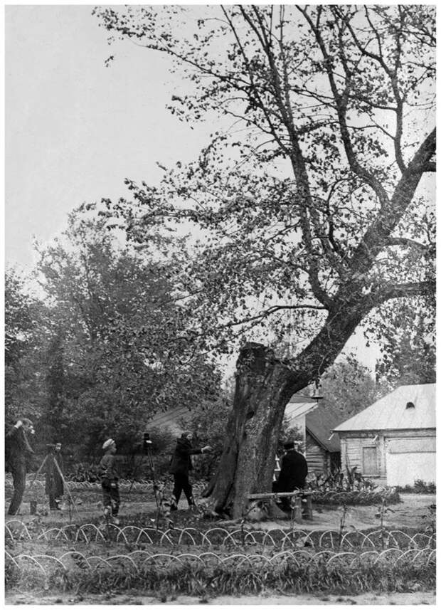 Петр Кулаков и Сергей Прокудин-Горский фотографируют Льва Толстого, сидящего под “деревом бедных” 1908 год
