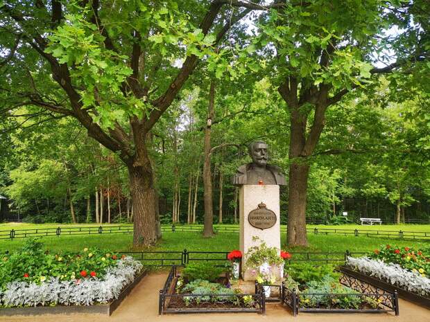 Перед деревьями установлен бюст Николаю II, вокруг которого высажены цветы.