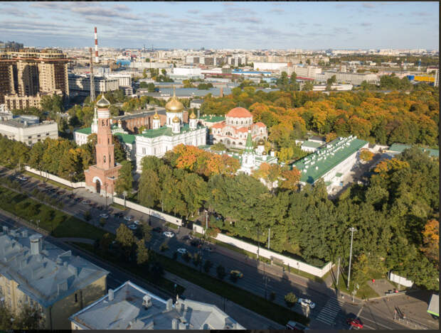 Утраченная и воссозданная колокольня Воскресенского Новодевичьего монастыря на Международном (Московском) проспекте.
