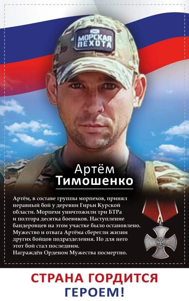 12 августа в бою у деревни Гирьи Беловского района Курской области, отражая превосходящие силы укронацистов, геройски погиб боец соединения морпехов-черноморцев Артем Тимошенко.