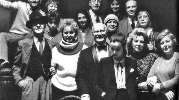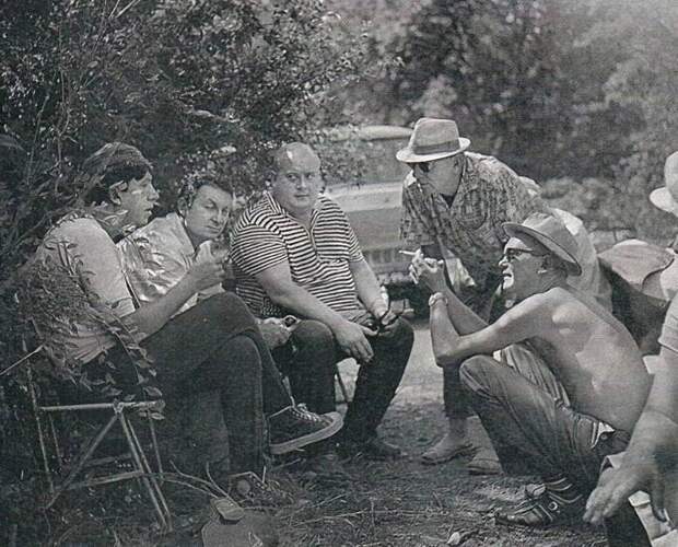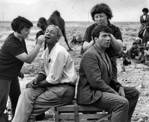 Евгений Евстигнеев и Сергей Юрский в окружении гримеров на съемочной площадке комедии Михаила Швейцера «Золотой телёнок» (1968).