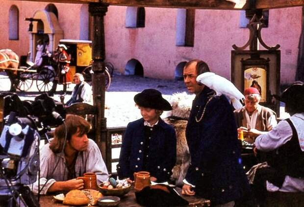 На снимках – обсуждение и репетиция сцены в таверне «Подзорная труба» в Бристоле. Там где Джим Хокинс (Стуков) познакомился с Сильвером и узнал зловещего пирата Черного пса (Караченцов). Вон его шапка видна на первом фото, между мальчиком и одноногим пиратом.