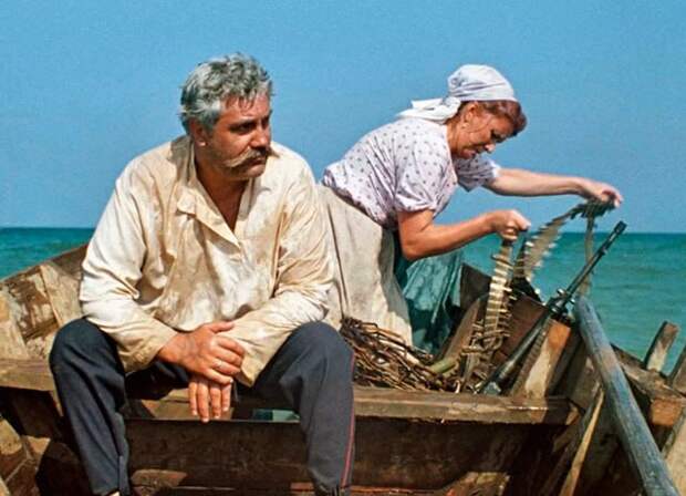 Фото со съемочной площадки и получившийся кадр из фильма «Белое солнце пустыни» (1969). Сцена, где жена Верещагина выбрасывает в море оружие и патроны.